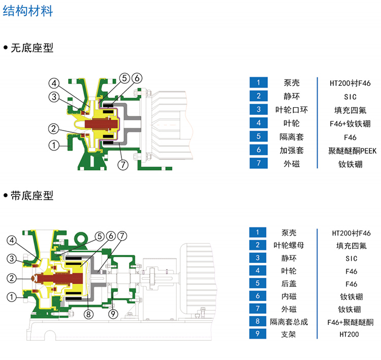 材料上:WJC-F耐腐蝕氟塑料磁力泵主軸、軸套采用間隙配合,且材質(zhì)均采用自潤(rùn)滑抗干磨無壓燒結(jié)碳化硅制成。泵的加強(qiáng)套采用碳纖維增強(qiáng)PEEK,無磁渦流現(xiàn)象,磁鐵采用稀土外磁及內(nèi)磁,磁性超強(qiáng)且不退磁。