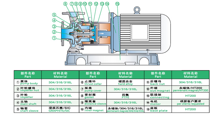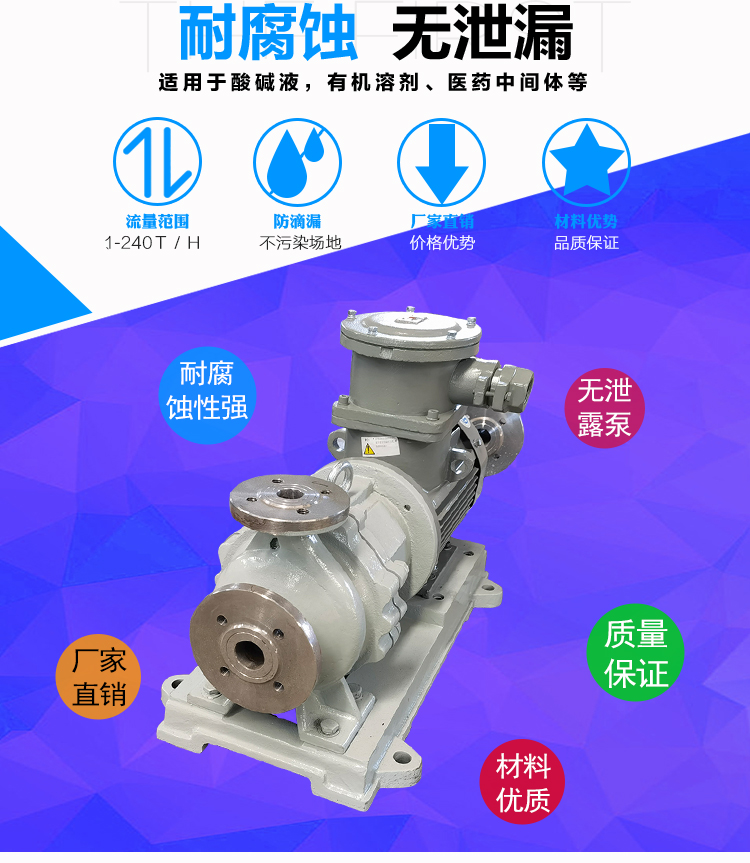 WJC不銹鋼磁力泵過流部件采用全不銹鋼材料(304、316、316L),內(nèi)、外磁轉(zhuǎn)子選用高磁能積、高矯頑力的稀土永磁制造,具有高效節(jié)能、介質(zhì)適用面廣、耐高溫、磁性強(qiáng)、不退磁等優(yōu)點,對有機(jī)酸,有機(jī)化合物,堿,中性溶液和各種氣體都有良好的耐蝕性,雙螺旋糟碳石墨軸承和硬質(zhì)合金軸套,具有較強(qiáng)的耐磨性,是應(yīng)用磁力耦合實現(xiàn)無接觸傳動、無動密封的新型高品質(zhì)磁力化工泵。保證了產(chǎn)品的壽命,是無泄漏輸送腐蝕性介質(zhì)的理想用泵。