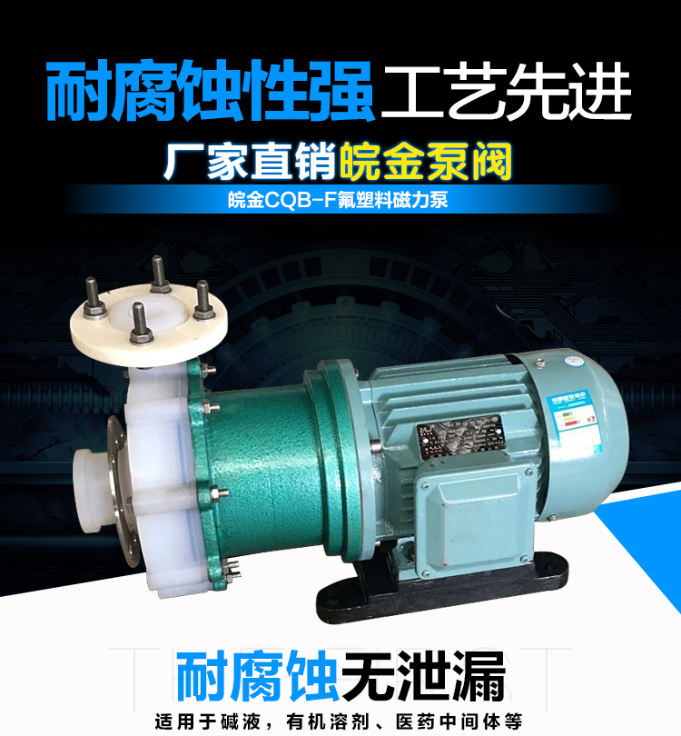 氟塑料磁力泵又稱其為氟塑料磁力離心泵、氟塑料磁力驅動泵、耐腐蝕磁力化工泵,CQB-F全塑磁力泵是我公司氟塑料磁力泵中的經典結構款型。氟塑料磁力泵另有:CQB-FA長支架型、CQB-FJ新升級型、IMD后拉式重型。